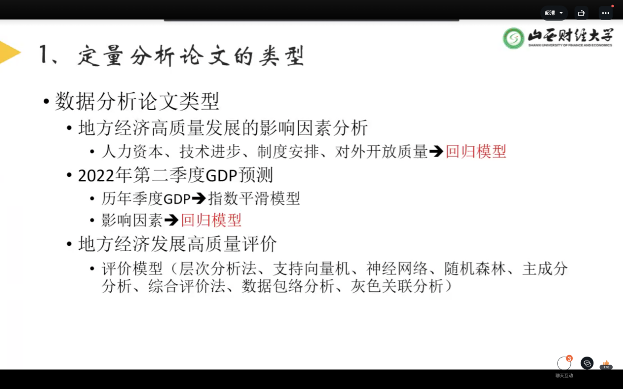 赵文老师针对数据收集与整理进行了专题分享。从一手数据和二手数据的获得途径为同学们介绍了调研问卷设计方法和规范,分享了目前主流的数据库和文献库,鼓励同学们既可以通过问卷设计进行实践调研,也可以充分利用专业数据库获取支撑研究问题的论据。重点从年鉴数据、企业数据等专题数据库介绍了如何进行指标提取与整理。在与同学们进行互动交流过程中,针对同学们提出的海量数据如何进行预处理以及如何应用问卷星进行设计给出了建议。