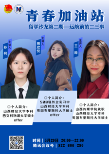 依托学院团委“青春加油站”品牌活动,于5月28日、29日通过线上形式举办了留学沙龙。本次沙龙邀请了在悉尼大学获得硕士学位的吴思粤、在剑桥大学获得博士学位的陶媛、在香港城市大学获得硕士学位解晶晶、在布里斯托大学获得硕士学位的田欣悦和王晔、就读于西交利物浦大学硕士研究生孙柯6位校友进行留学经分享。学院青年教师和部分同学参加。