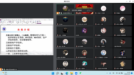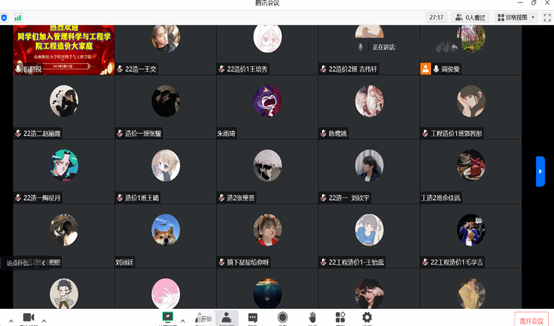 工程造价专业2022级新生和教师相约腾讯会议云端,准时开启了2022级工程造价专业新生专业教育第一讲《工程造价专业教育-专业介绍及角色转变》。本次课程由二级教授、工程造价专业资深教师阎俊爱教授主讲,教研室主任白鹏锐主持。