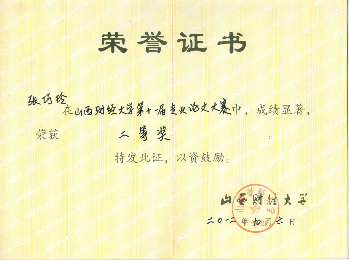 2009管理科学班张巧玲同学获山西财经大学第十一届专业论文大赛二等奖。