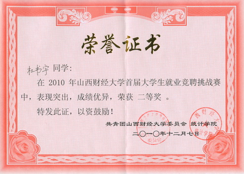 2010年12月7日,正妹av 杜书宇同学在2010年山西财经大学首届大学生就业竞聘挑战赛中荣获二等奖。