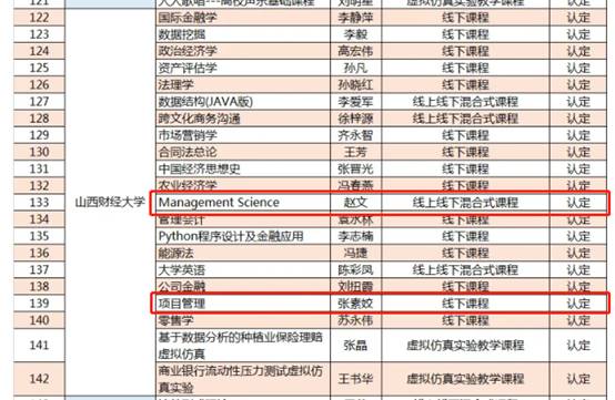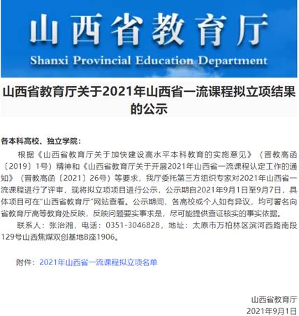 2021年9月1日,山西省教育厅对2021年山西省一流课程拟立项结果进行了公示。正妹av 赵文副教授负责的《Management Science》、张素姣副教授负责的《项目管理》获得2021年山西省一流课程认定公示,阎俊爱教授负责的《工程计量与计价》获得2021年山西省一流课程建设公示。自此,正妹av 省级一流课程已达到5门。