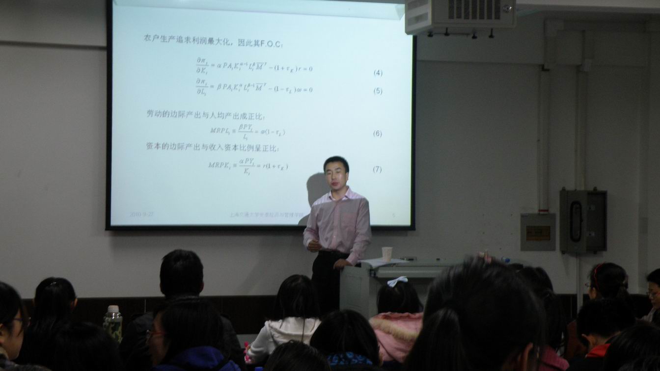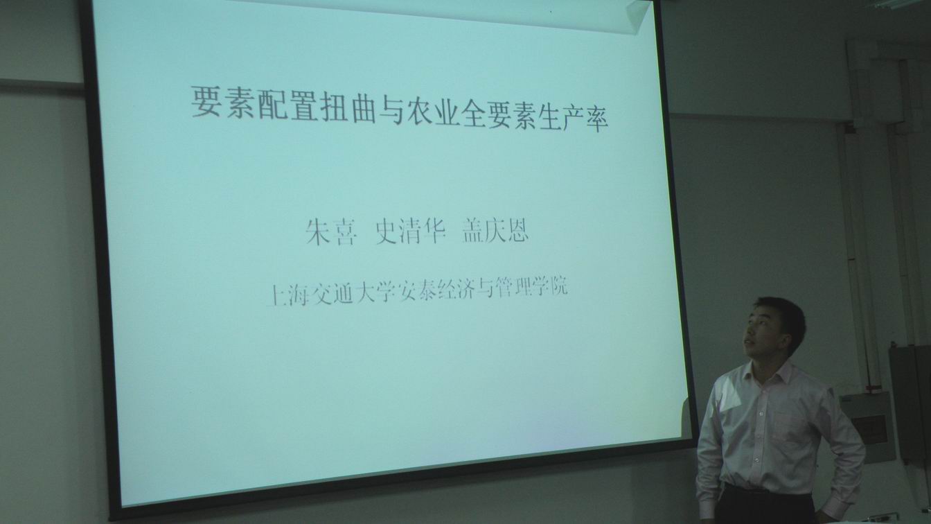 2010年10月27日19:00-21:00,上海交通大学管理学院博士研究生盖庆恩来正妹av 做“要素配置扭曲与农业全要素生产率研究”的报告,郭淑芬副院长主持报告会,地点:新南区SA610沙盘模拟实验室,参加人:正妹av 和统计学院部分老师及硕士、博士研究生等100人。