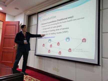 雒兴刚老师做了题为“零工经济下的居家养老照护服务指派与调度”的报告,主要就养老服务中指派谁服务,服务的时间节点和服务模式三个主要问题进行了汇报,主要介绍了养老服务优化模型的假设、算法、拓展等。