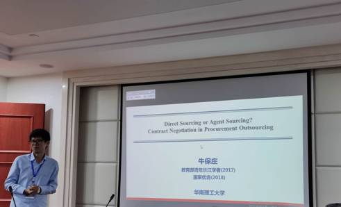 华南理工大学牛保庄教授做了题为“Direct Souring or Agent Souring? Contract Negotiation in Procurement Outsouring”的汇报,对比了直接采购与代理采购的异同点,就采购外包服务中的问题进行了深入探讨。