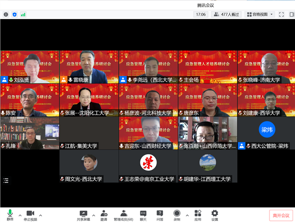 应急管理教研室组织全体教师参加了由应急管理本科专业高校联盟主办、西北大学应急管理学院承办的线上“应急管理人才培养研讨会(2022)”。会议由西北大学应急管理学院院长雷晓康和西北大学公共管理学院副院长李尧远主持,来自西北大学、中国人民大学、南京师范大学、山西师范大学等高校的25位专家学者就应急管理专业人才培养方案进行了汇报与交流。